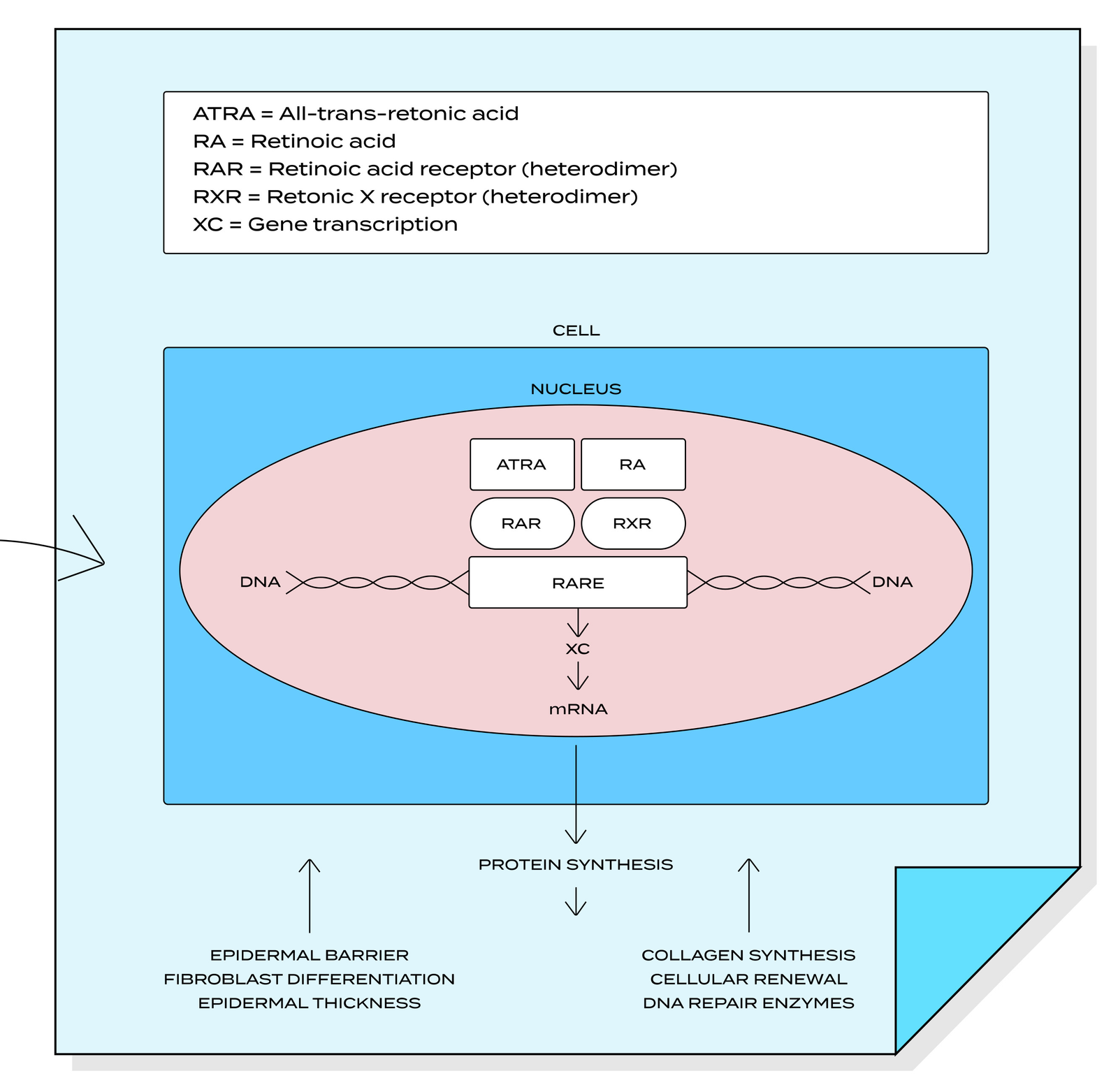 The formulation, stabilization and delivery mechanism of Retinol greatly affects its efficacy and side effect profile. This can result in its powerful anti-aging benefits without the irritation of a prescription strength Retinoic Acid. This is due to less extracellular product to minimize irritation and greater efficacy from more internuclear retention of the product.