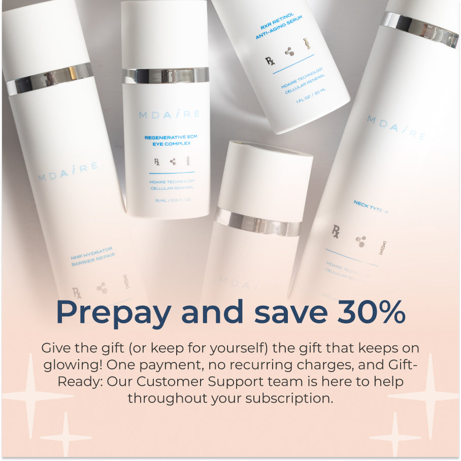 Our exclusive holiday prepaid subscriptions are here — designed to deliver months of curated MDAiRE essentials with one upfront payment. Each subscription begins shipping December 10th and continues monthly, making it the most luxurious way to gift real, visible results.